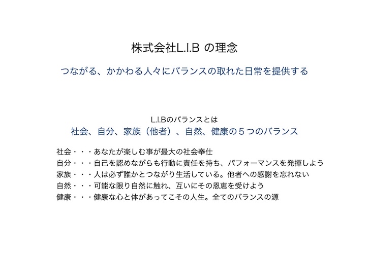 Life is Balance(ライフイズバランス)の頭文字から社名をL・I・Bと名づけました。会社、そこで働く従業員、そしてユーザーであるお客様。誰か一人が得するわけではなく、全ての人がフェアなトレードであるように。